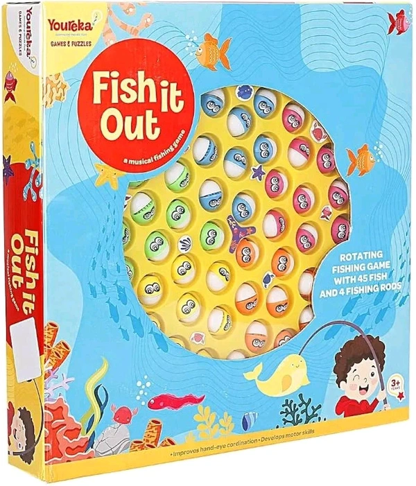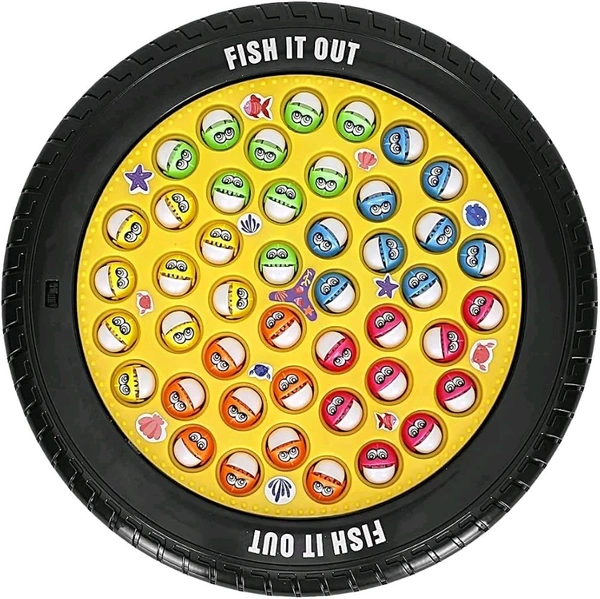 Patna Toys Musical Rotating Tyre Fishing Game Toy with 45 Fishes and 4 Poles for Kids - 4 Players (Yellow)